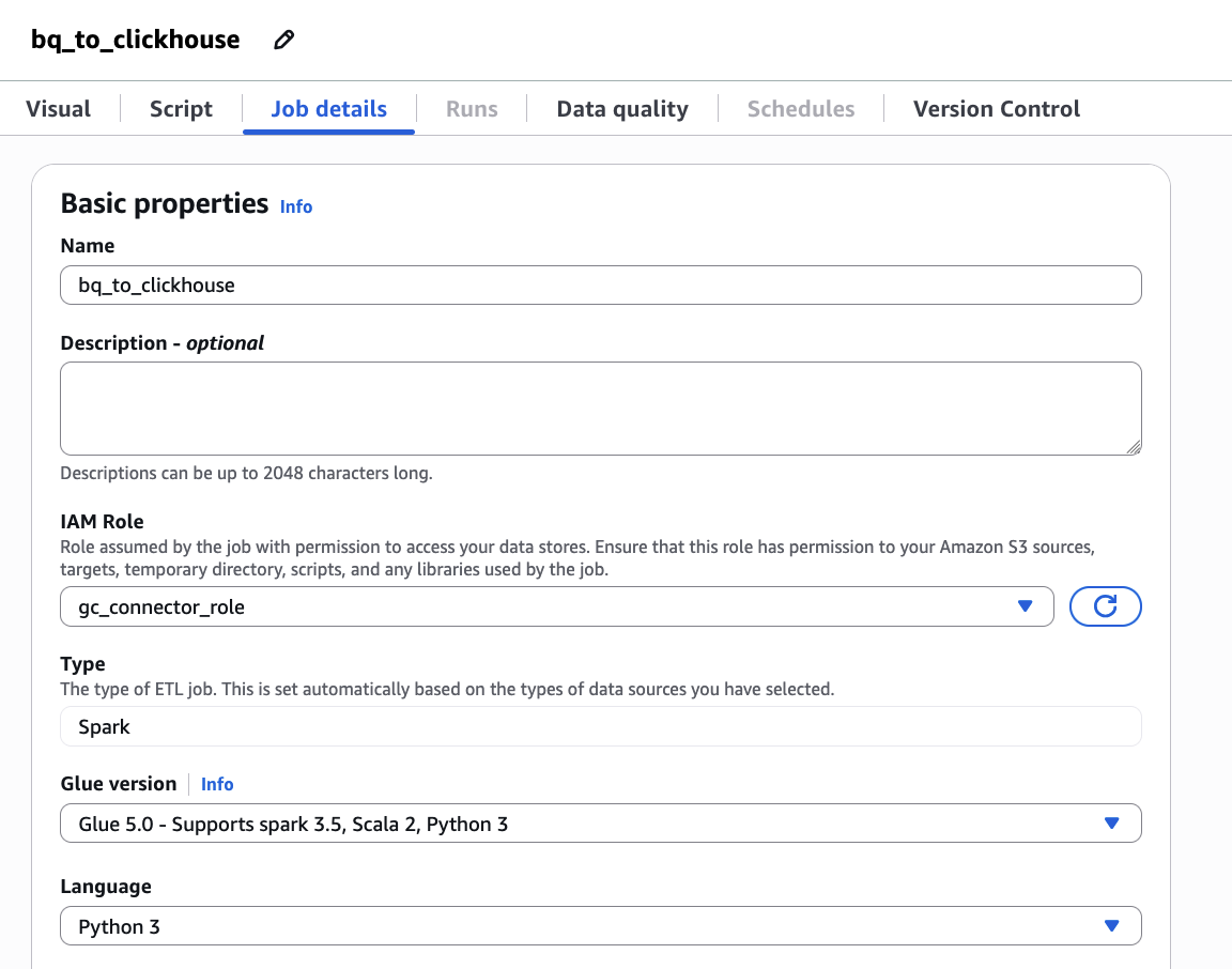 2. Enter bq_to_clickhouse as its job name and configure gc_connector_role as its IAM Role
