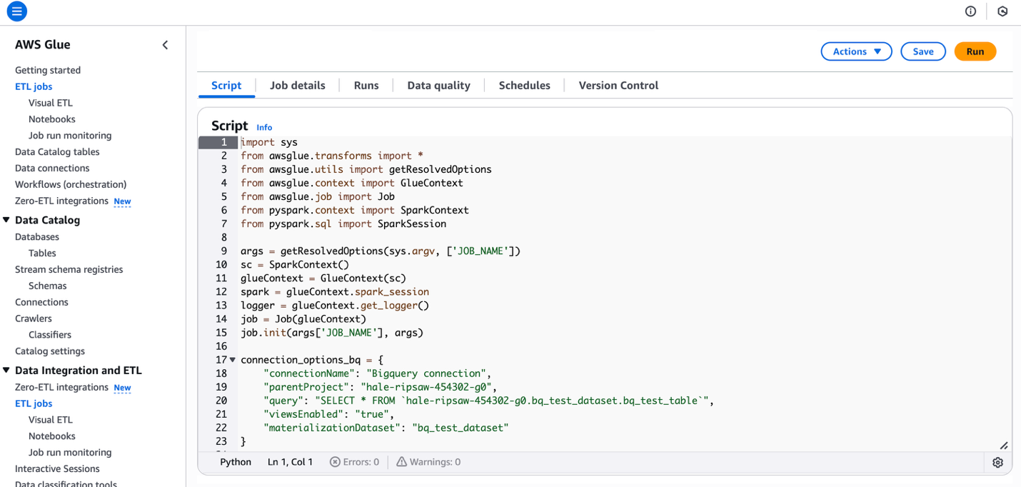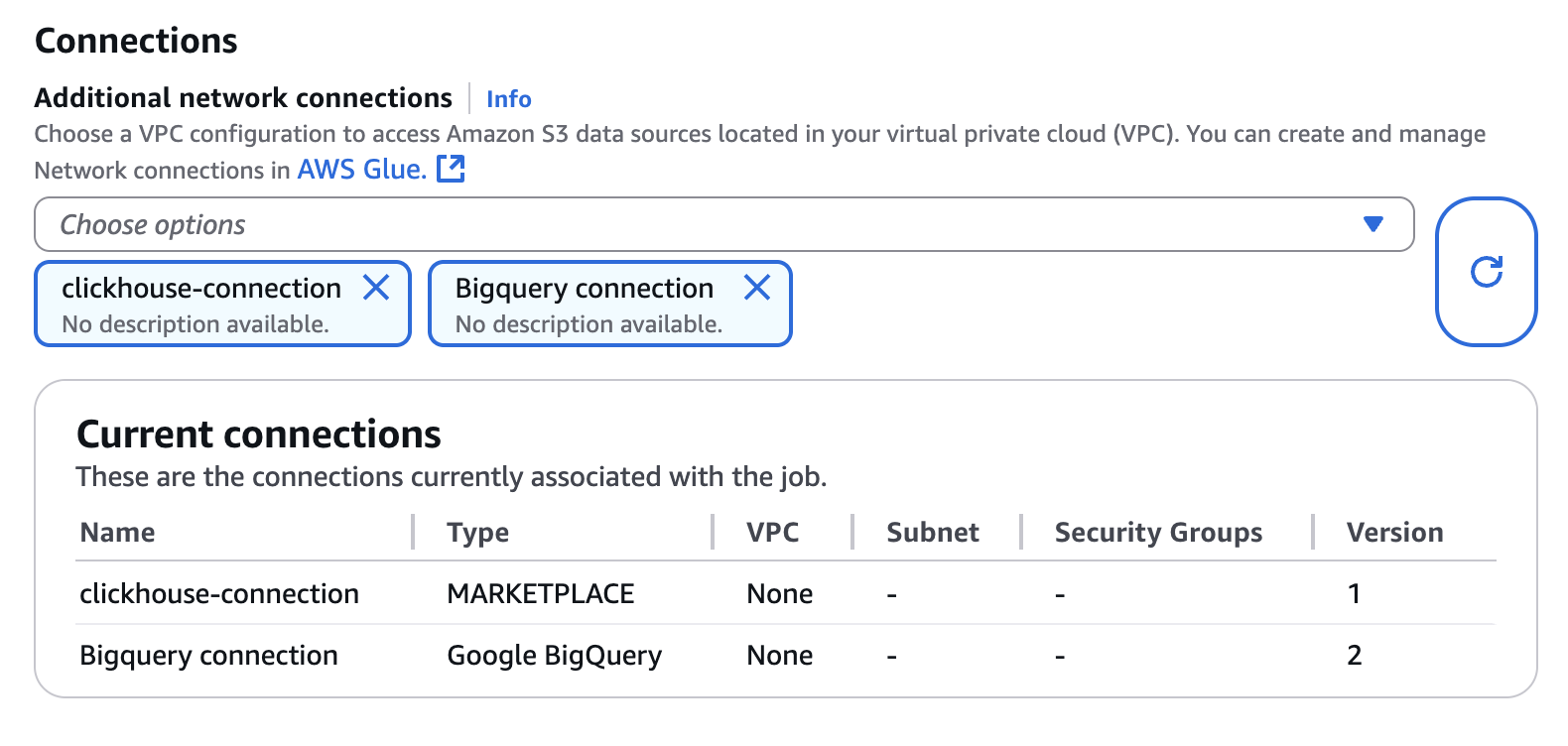 AWS Glue ETL enables organizations to discover, prepare, and integrate data at scale without the burden of managing infrastructure. With its built-in connectivity, Glue can seamlessly read data from Google Cloud’s BigQuery and write it to ClickHouse Cloud on AWS, removing the need for custom connectors or complex integration scripts. Beyond connectivity, Glue also provides advanced capabilities such as a visual ETL authoring interface, automated job scheduling, and serverless scaling, allowing teams to design, monitor, and manage their pipelines more efficiently. Together, these features simplify data integration, reduce latency, and deliver significant cost savings, enabling faster and more reliable migrations.