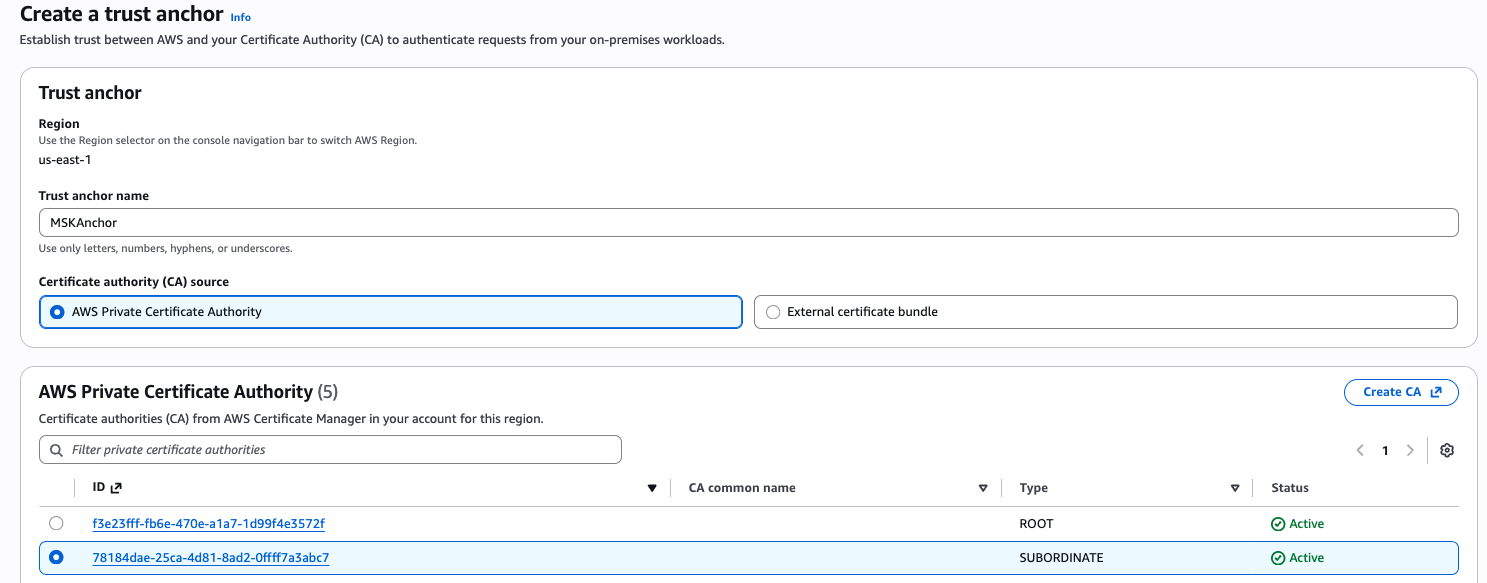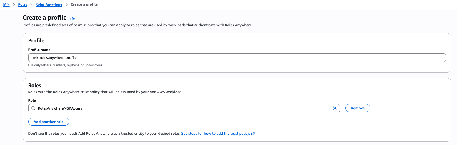 To enable IAM Roles Anywhere for your on-premises Kafka client machine, you must configure two essential components in AWS Roles Anywhere: the trust anchor and the profile. The trust anchor establishes the trust relationship between Roles Anywhere and your certificate authority. This trust is utilized for authenticating certificates to obtain credentials for an IAM role. Profiles are predefined sets of permissions that are applied once successful authentication with Roles Anywhere has been achieved.