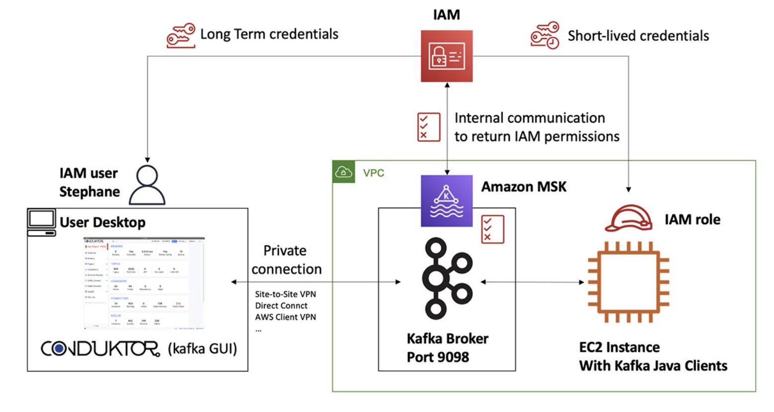 - The feature only works out of the box for Java-based clients. If you’re interested in using IAM authentication with Apache Kafka clients written in languages other than Java, see the following GitHub repo. At a high level, this involves implementing a SASL mechanism that uses the AWS SDK to fetch client credentials and sends a very specific JSON authentication payload to the MSK cluster, which then automatically handles access control.
