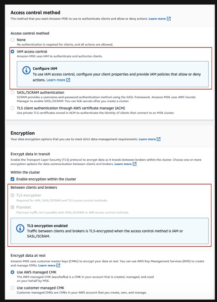 When creating a MSK cluster, you can enable one of several security mechanisms. The IAM-based security mechanism runs on port 9098 on your Apache Kafka brokers, and consists of only one setting to enable in your cluster configuration.
