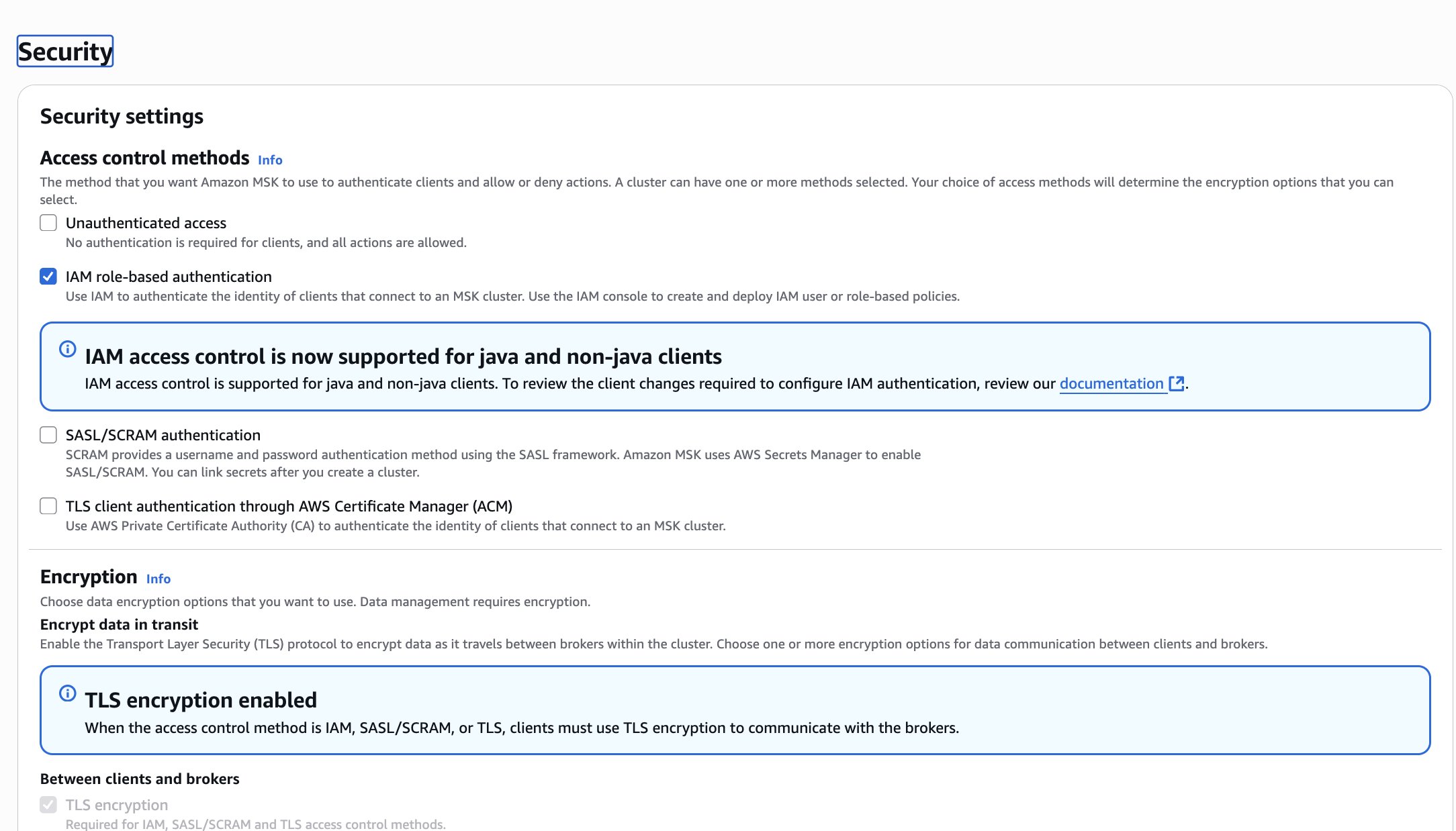 This is a game-changer from a security perspective for AWS customers who use Apache Kafka: I recommend Amazon MSK customers use IAM Access Control unless they have a specific need for using mutual TLS or SASL/SCRAM authN/Z.