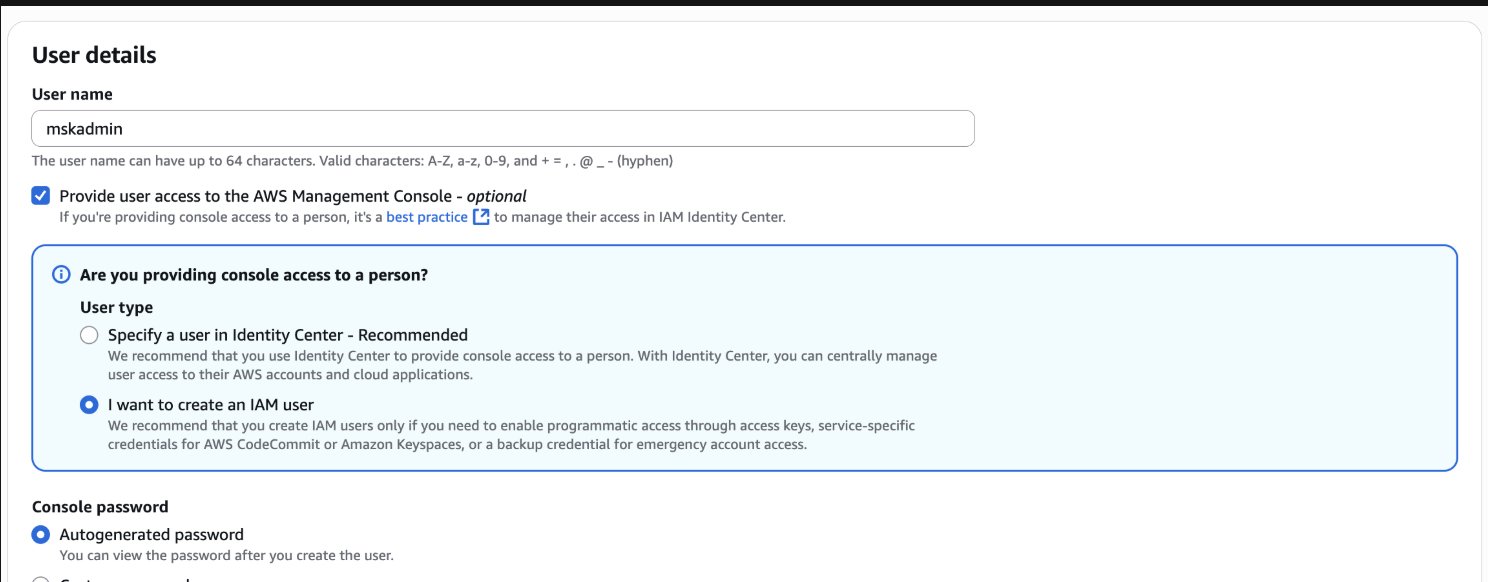 I created the following customer-managed IAM policy and attached it to my user mskadmin in AWS: