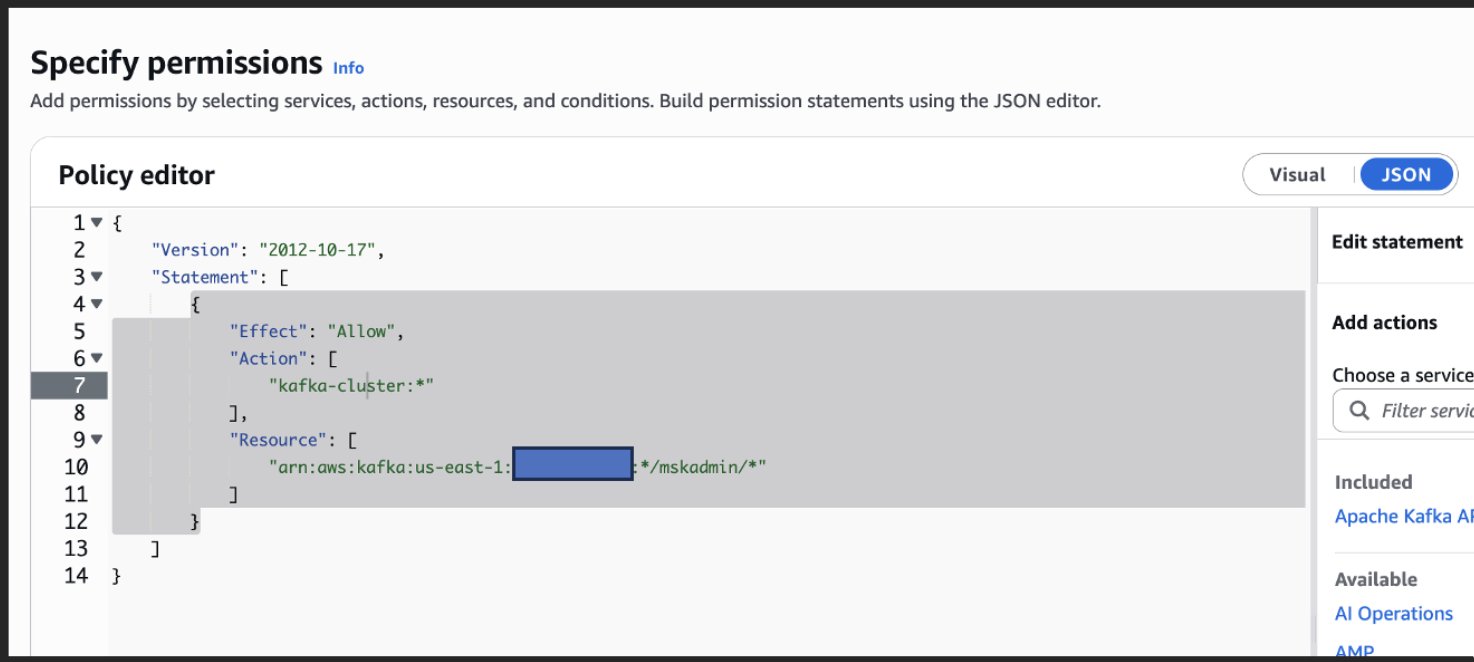 We can add the minimum privilege we need to write to that topic. Make sure to replace Account-ID and MSK-Cluster with your account and MSK cluster specific details.