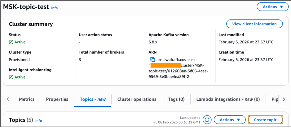 Amazon Managed Streaming for Apache Kafka (Amazon MSK) now streamlines topic management by supporting new topic APIs and console integration. You can programmatically create, update, and delete Apache Kafka topics using familiar interfaces including AWS Command Line Interface (AWS CLI), AWS SDKs, and AWS CloudFormation. With these APIs, you can define topic properties such as replication factor and partition count and configuration settings like retention and cleanup policies. The Amazon MSK console integrates these APIs, bringing all topic operations to one place. You can now create or update topics with a few selections using guided defaults while gaining comprehensive visibility into topic configurations, partition-level information, and metrics. You can browse for topics within a cluster, review replication settings and partition counts, and go into individual topics to examine detailed configuration, partition-level information, and metrics. A unified dashboard consolidates partition topics and metrics in one view.