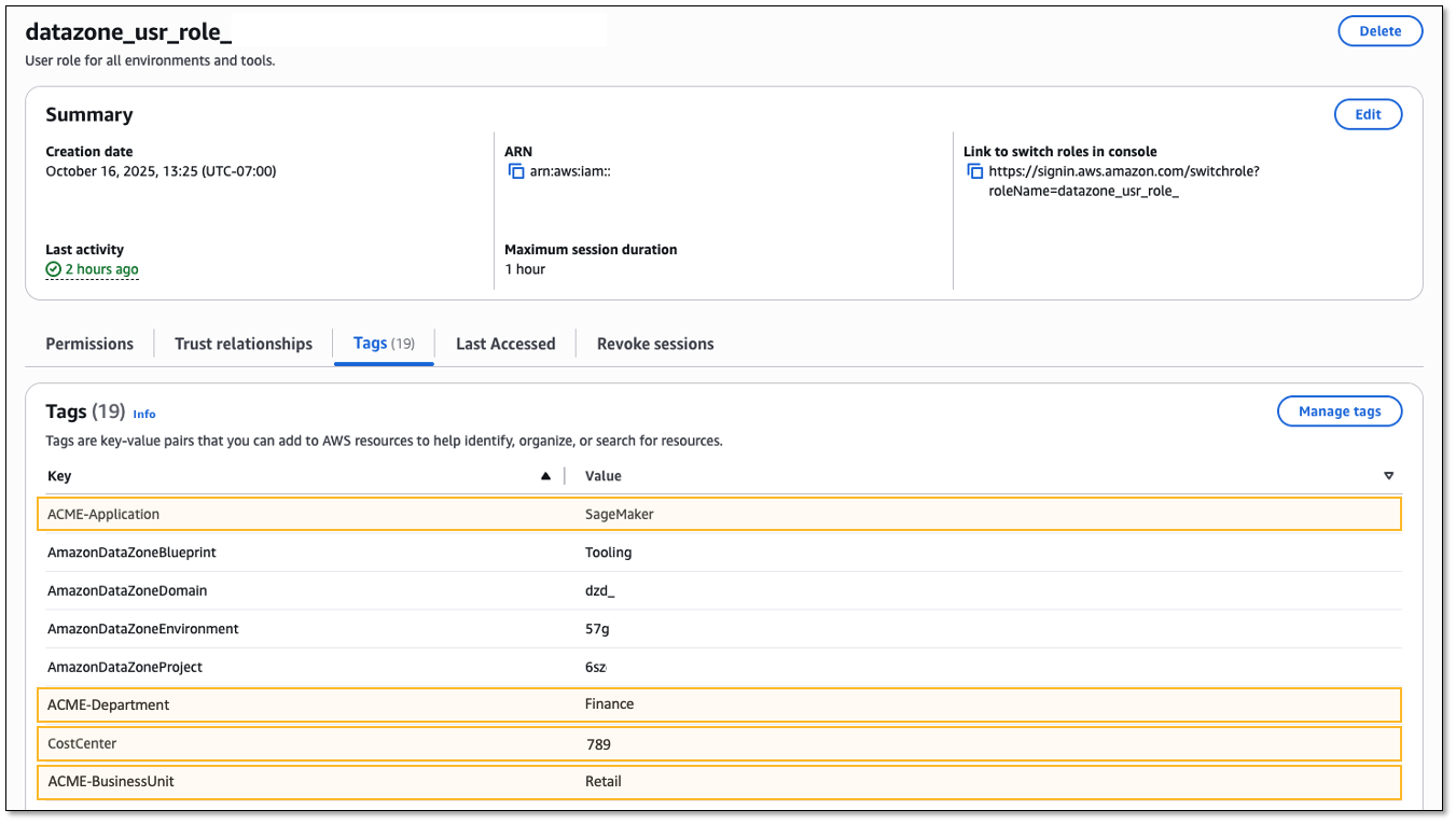 The AmazonSageMakerProvisioning-<accountId> role has an AWS managed policy with condition aws:TagKeys allowing tags to be created by this role only if the tag key begins with AmazonDataZone. For this example, we will change the tag key to begin with different strings. Skip to Create a new project profile with project resource tags configured if you don’t need tag keys to have a different structure (such as begins with, contains, and so on)