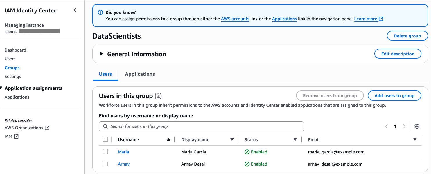 - Three IAM Identity Center users (Arnav, Maria, and Wei) and two groups (DataScientists and MarketAnalytics). For instructions on creating IAM Identity Center users, refer to Add users to your Identity Center directory. For instructions on creating groups, refer to Add groups to your Identity Center directory.
