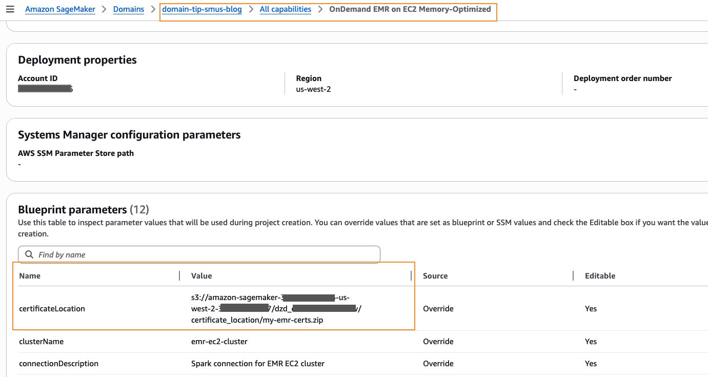 - The domain’s project profile should be enabled with Amazon EMR on EC2. You can choose either General purpose or Memory-Optimized profile. You will have to provide a value for certificateLocation, as shown in the following screenshot. For detailed instructions, refer to Specify PEM certificate for EmrOnEc2 blueprint. For this post, you can use OpenSSL to generate a self-signed X.509 certificate with a 2048-bit RSA private key. Detailed instructions for creating one are at the bottom of Create keys and certificates for data encryption with Amazon EMR.