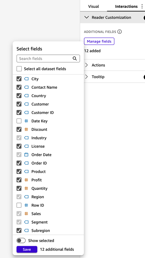 - With Reader Customization enabled, manage which fields you want readers to be able to add or remove. The available fields are based on the dataset that the visual is sourced from. By default, if the author doesn’t enable any additional fields, readers can remove, add back, hide, show, reorder, and change aggregations for the existing fields in the visual.