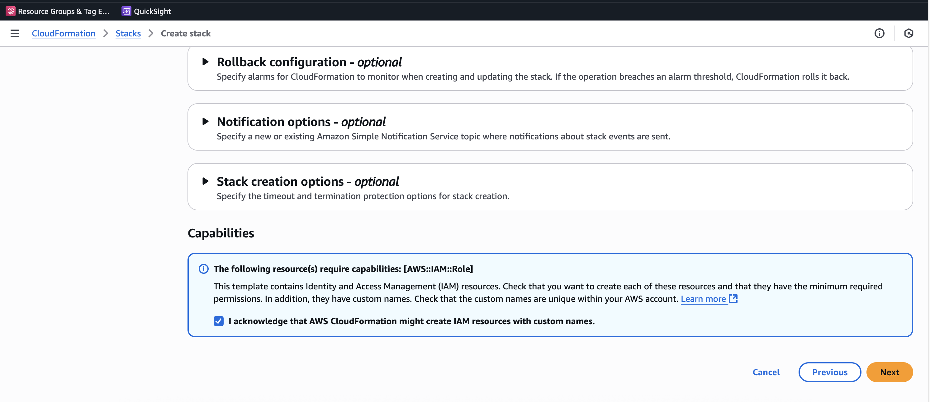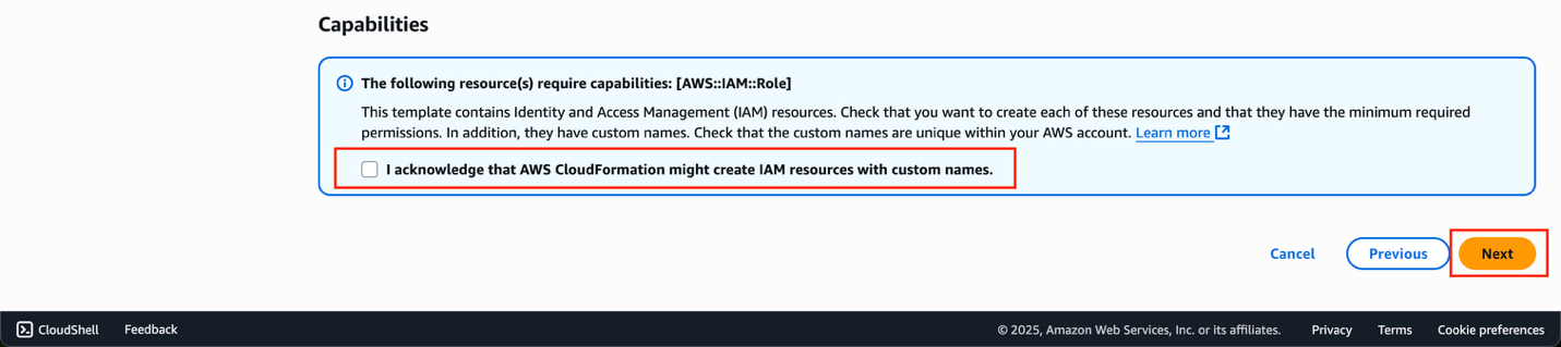 - Acknowledge the creation of IAM policies and roles for various resources and choose Next.