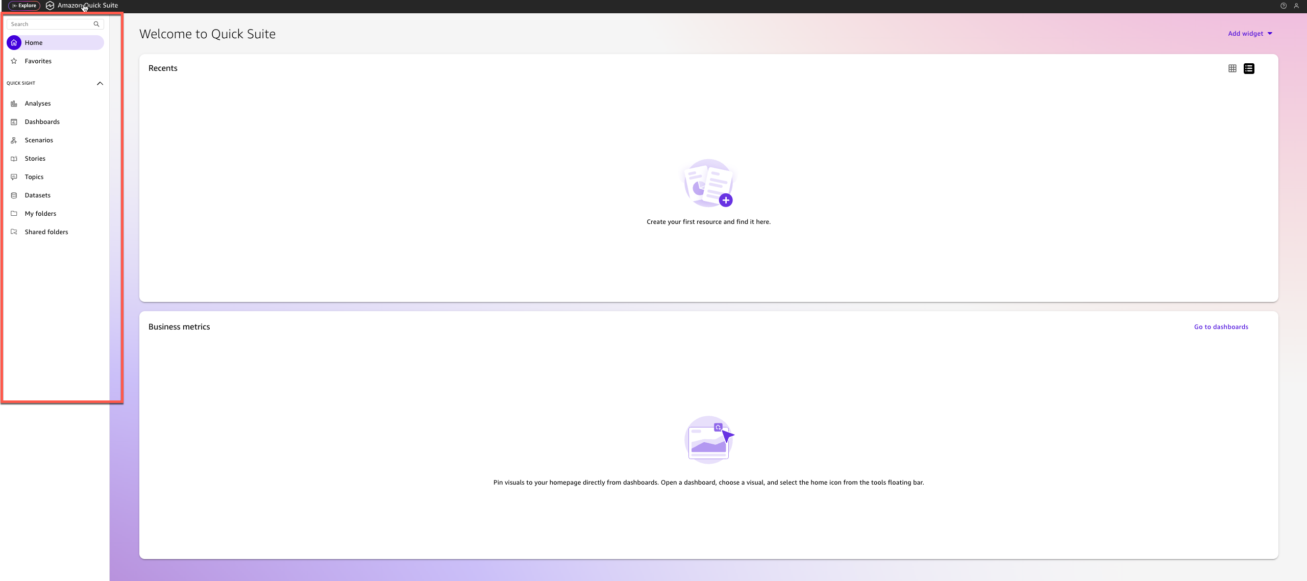 - Navigate to the Quick Suite home page and confirm that all the new AI capabilities are turned off.