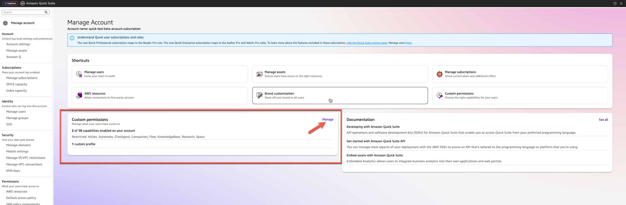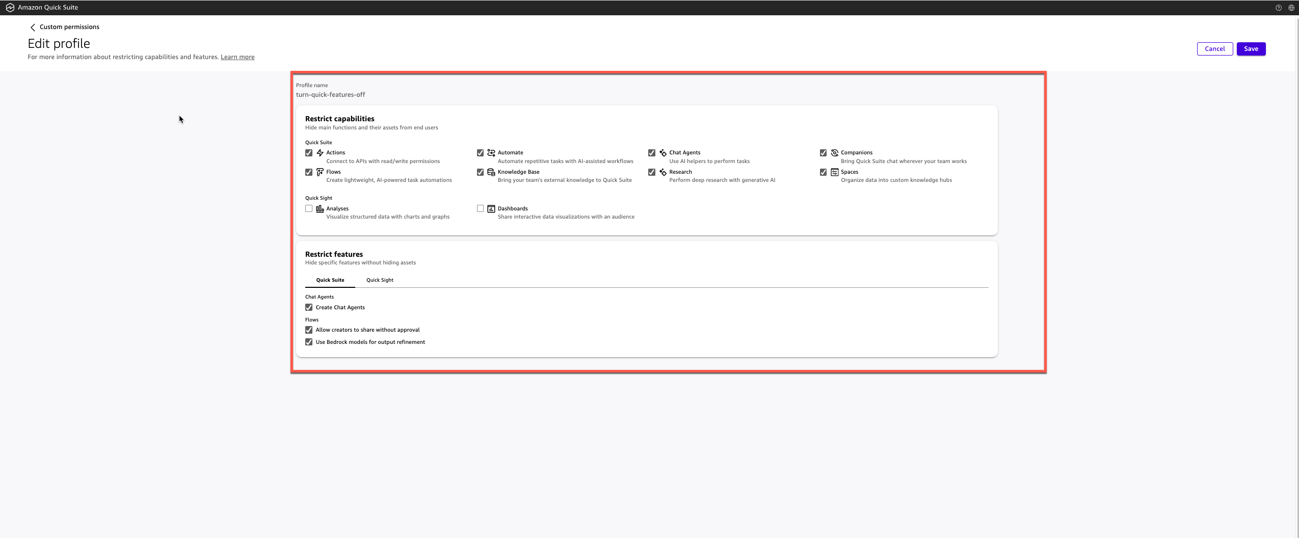 Properly configuring custom permissions can help you achieve enhanced security posture, regulatory compliance, and operational confidence as your organization scales its use of the advanced capabilities of Quick Suite. For more details, refer to Creating a custom permissions profile in Amazon Quick Suite.