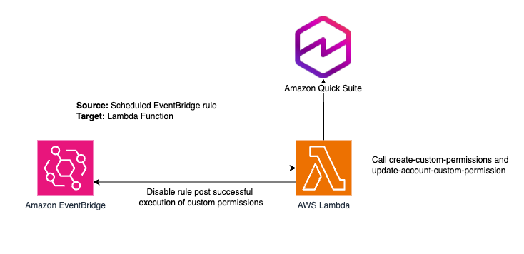 The CloudFormation template creates the necessary resources in your AWS account. After you deploy the stack, the Lambda function orchestrating the creation and assignment of custom permissions at the account level through public Quick APIs is automatically triggered. The specific custom permission created through this code will disable the new Quick Suite AI capabilities at the account level.