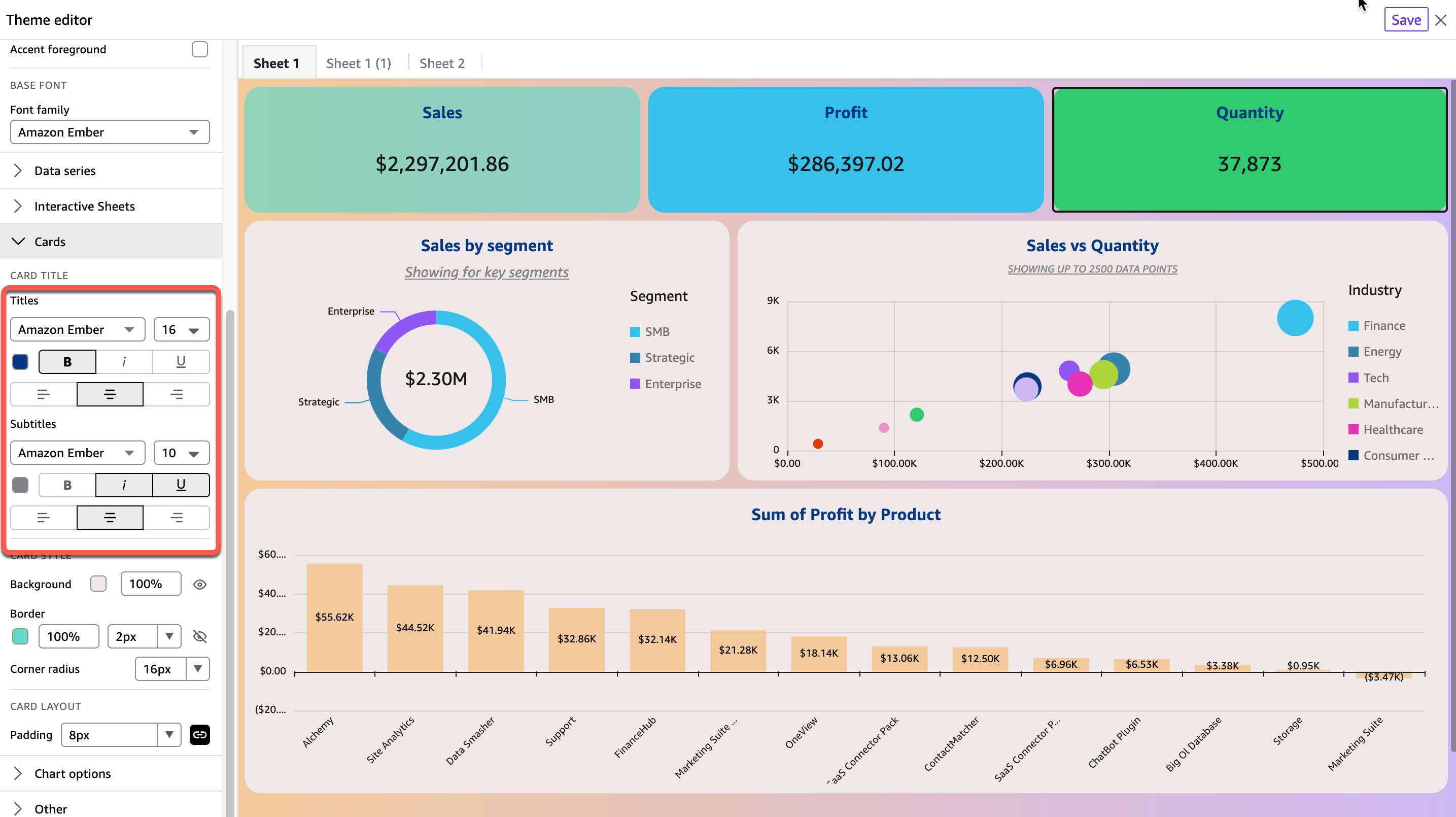 Amazon Quick Sight now offers custom typography options to all dashboard visuals along with the capability to manage it in one place. In the following dashboard example, both the title and subtitle have been modified for all visuals using themes. This setting is found in the theme editor, under the Cards section.