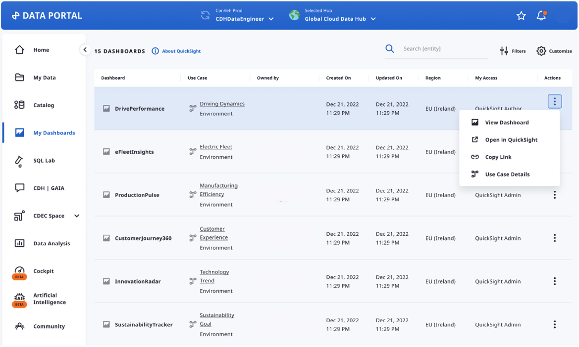 Recognizing the new frontier of knowledge silos, BMW Group has expanded its vision for the CDH beyond data sharing to knowledge sharing. In this blog post, we show you how promoting Amazon Quick Sight dashboards to discoverable, shareable data products within the CDH creates a unified knowledge layer that amplifies the value of data-driven insights. This next phase in BMW Group’s data journey ensures that actionable intelligence flows as freely as the data that powers it, creating additional returns on investment into a central data platform.
