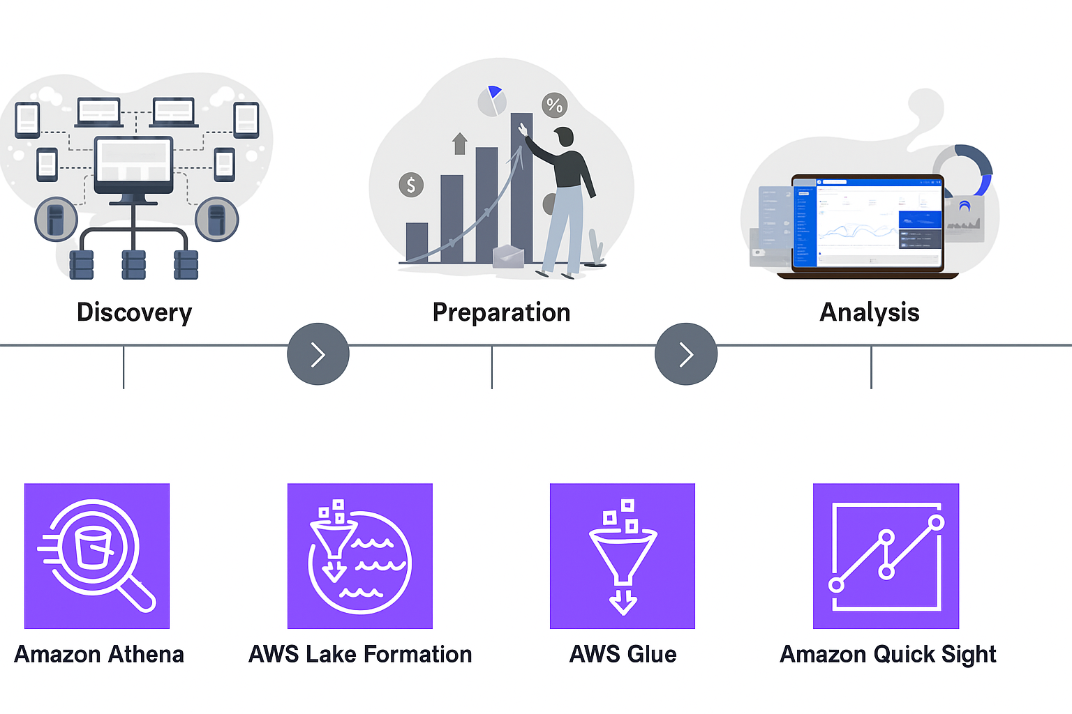 As shown in the preceding figure, it starts with data discovery. Data consumers search the CDH global business data catalog for data assets relevant to their use case. To dive deeper into the data assets, they explore them directly in the CDH Data Portal running Amazon Athena SQL queries on a limited preview of the data. After they are confident that the data asset is needed for their use case, they can request access to the full data asset. Data access is controlled by AWS Lake Formation at the column and row level. Next, to prepare the data for visualization and analysis in Quick Sight, users use the extract, transform, and load (ETL) capabilities available in AWS Glue Studio. At the visualization frontier, Quick Sight serves as the critical bridge between complex analysis and business action. Its interactive dashboards democratize insights across organizational hierarchies, enabling decision-makers to explore data relationships without technical barriers.