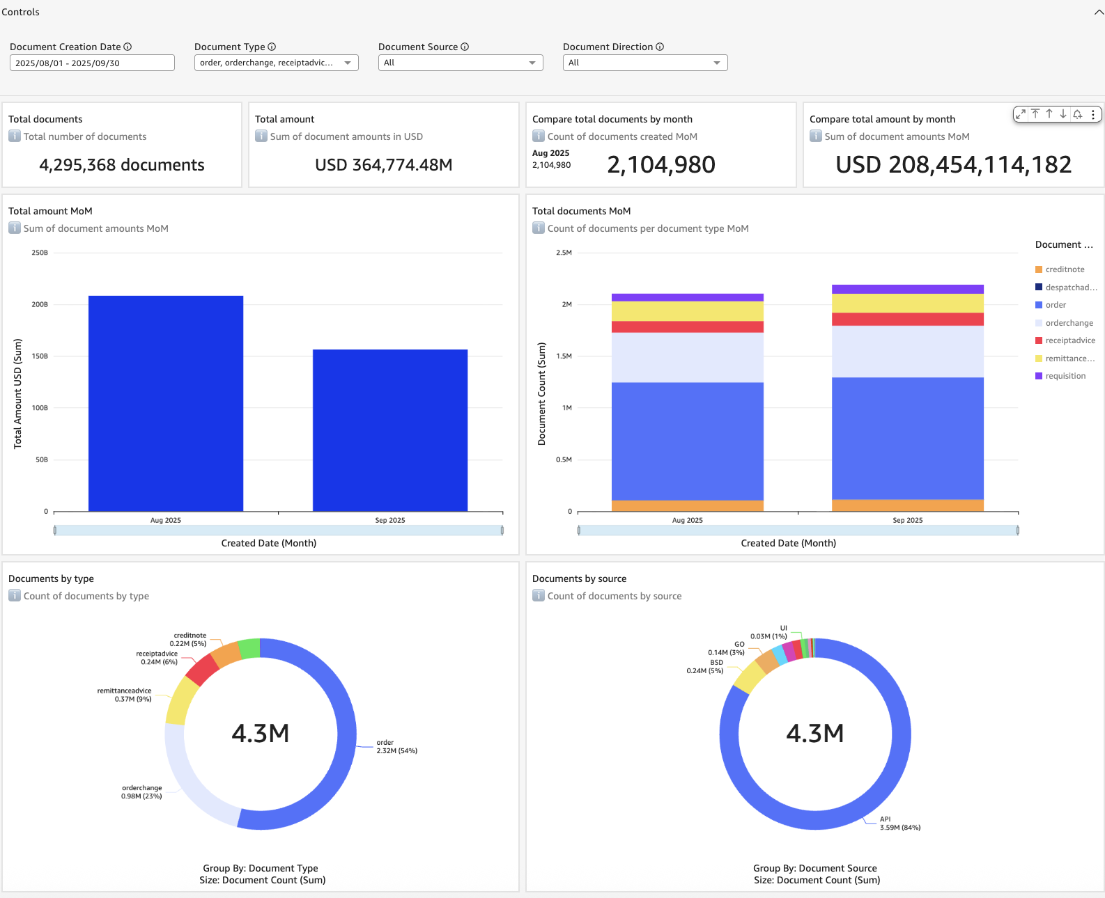 By providing granular visibility into document-level data, the dashboard enables efficient payment processing, cost optimization, and informed business decisions, making it an invaluable resource for financial operations management The document analytics dashboard provides buyers with real-time visibility into their transaction flows. Using Amazon Q, buyers can quickly analyze spending patterns with queries such as “What is my total spend by supplier category in Q3?” This has enabled more strategic sourcing decisions and better cash flow management.