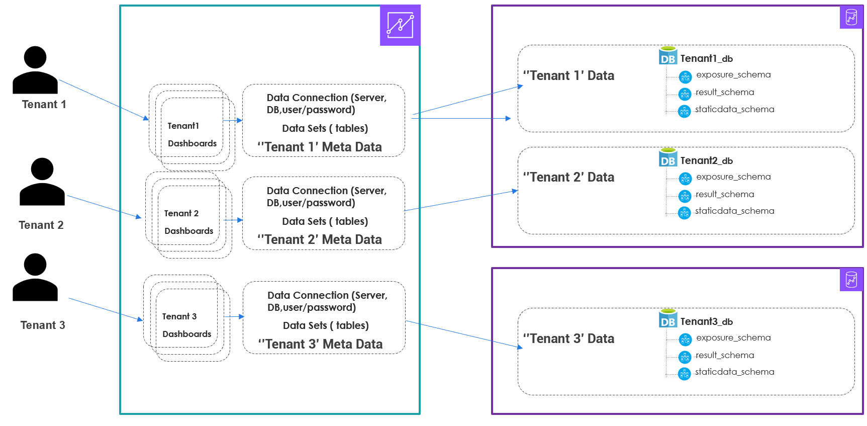 Our multi-tenant architecture, illustrated in the following diagram, facilitates complete data isolation between clients. Each tenant has their own dedicated database schemas for exposure, results, and static data. Quick Sight provides APIs to programmatically deploy separate datasets and dashboards for each tenant, helping us maintain the secured architecture in the BI layer as well.