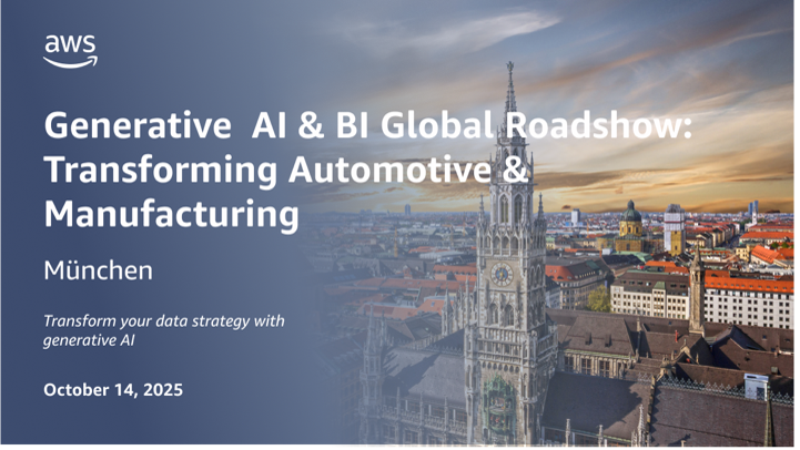 Generative AI & BI Global Roadshow: Transforming Automative & Manufacturing | Munich, Germany | October 14 Learn how leading organizations are using generative AI and BI to reshape their data strategies. Industry leaders and AWS experts will share insights and demonstrate how the latest AI services—including Amazon SageMaker Studio, Amazon Q, and Amazon QuickSight—are driving productivity and enabling smarter, data-driven decision-making. |