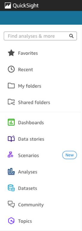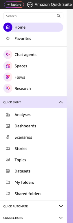 The following screenshots compare the previous QuickSight navigation pane to the enhanced Quick Suite navigation pane.