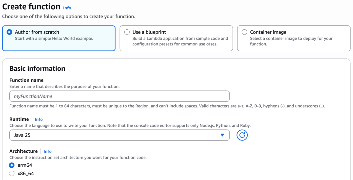 Creating Java 25 function in AWS Management Console