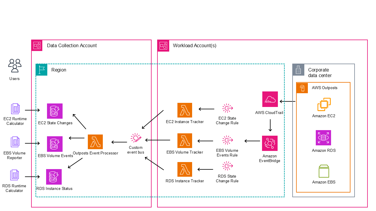 Organizations using AWS Outposts racks commonly manage capacity from a single AWS account and share resources through AWS Resource Access Manager (AWS RAM) with other AWS accounts (consumer accounts) within AWS Organizations. In this post, we demonstrate one approach to create a multi-account serverless solution to surface costs in shared AWS Outposts environments using Amazon EventBridge, AWS Lambda, and Amazon DynamoDB. This solution reports on instance runtime and allocated storage for Amazon Elastic Compute Cloud (Amazon EC2), Amazon Relational Database Services (Amazon RDS), and Amazon Elastic Block Store (Amazon EBS) services running on Outposts racks. In turn, teams can track the cost of infrastructure associated with their workloads across AWS accounts. This solution is a framework that can be customized to meet your organization’s specific business objectives.