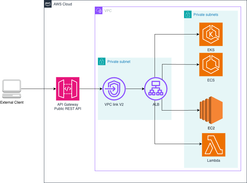 With direct private ALB integration, this architecture becomes simpler and more efficient. The integration removes the need for an intermediate NLB, reducing the number of hops between client and your services. This streamlined setup simplifies the architecture for applications, allowing more efficient use of ALB’s layer-7 load-balancing capabilities, authentication, and authorization features. While these ALB features were technically accessible before, the new architecture removes the overhead and complexity of managing an additional NLB. Here’s how the simplified architecture looks now:
