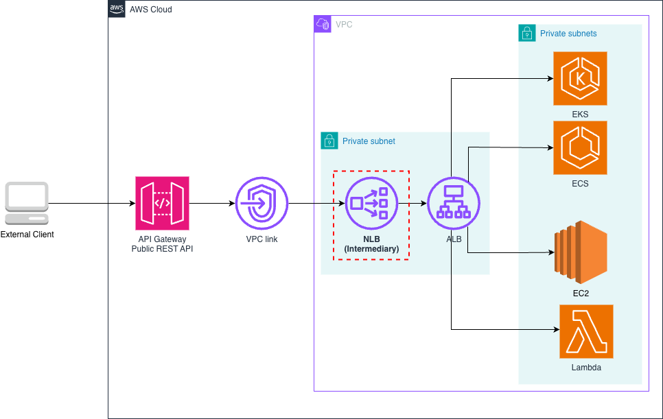 Figure 1. Previous architecture: API Gateway to private ALB via intermediary NLB