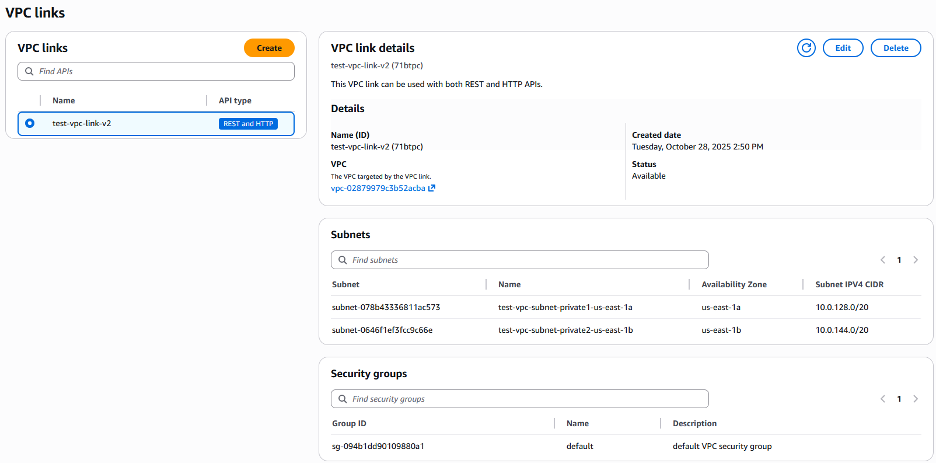 - Choose Create and wait for the VPC link status to become Available. This process can take a few minutes.