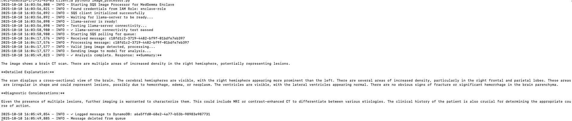 In this project, MedGemma 4B serves as a reference medical LLM, showing how domain-adapted fine-tuning can enhance a model’s ability to interpret, reason about, and respond to complex medical queries. It also provides a foundation for exploring the safe and effective use of LLMs in healthcare applications, while being securely deployed within a Nitro Enclave. However, you can choose to deploy your own medical FM if needed. This is a deeper overview on the 4B model.