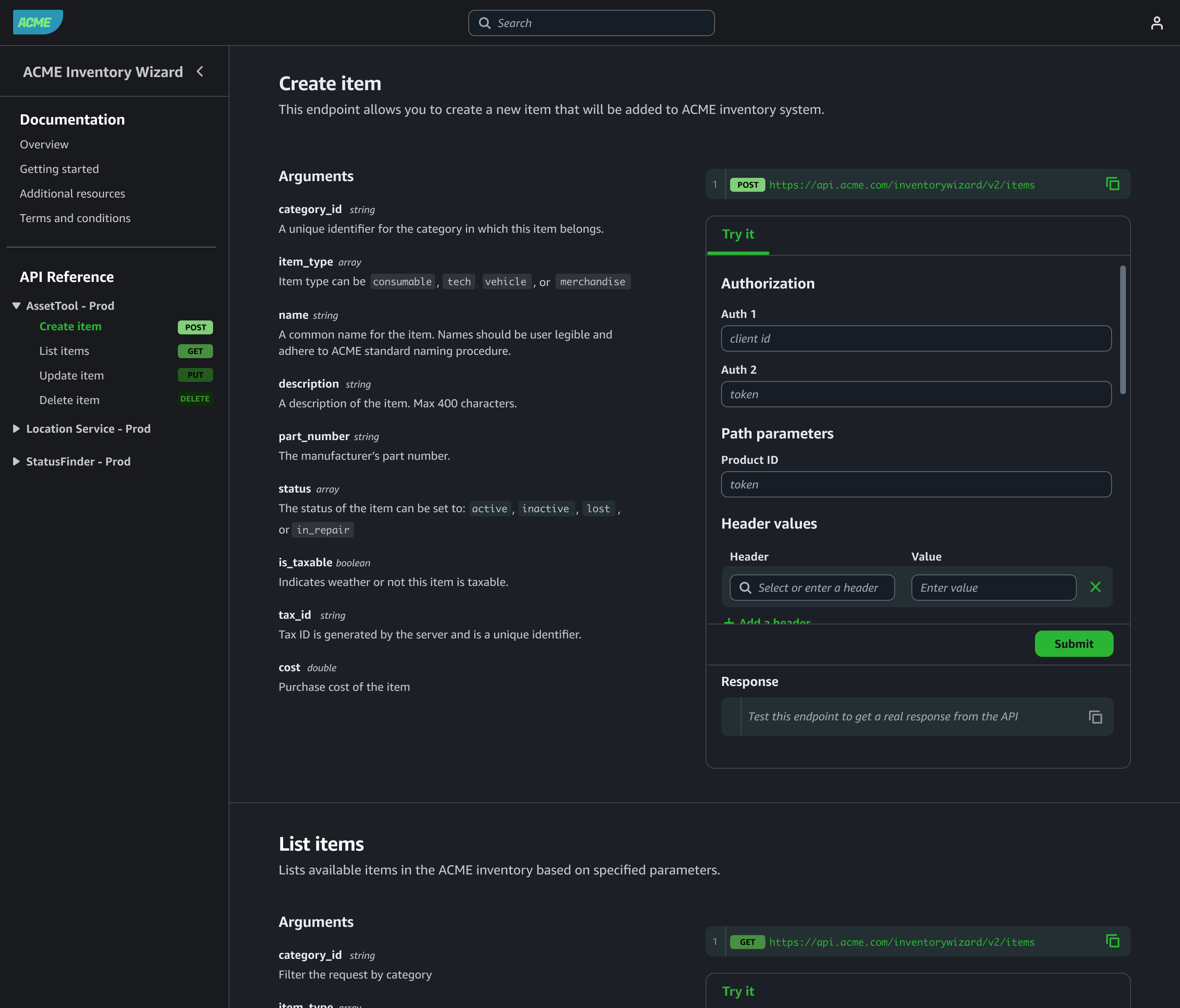 Search, discovery, and interactive API exploration: Consumers can search across your entire catalog. The portal provides intuitive customizable navigation and organization to help users find the right endpoints for their needs. Using the “Try It” functionality consumers can try APIs directly from the portal. Users can input request parameters, headers, and see live responses, reducing time-to-value for API integrations. This environment includes built-in limits for security and cost control.