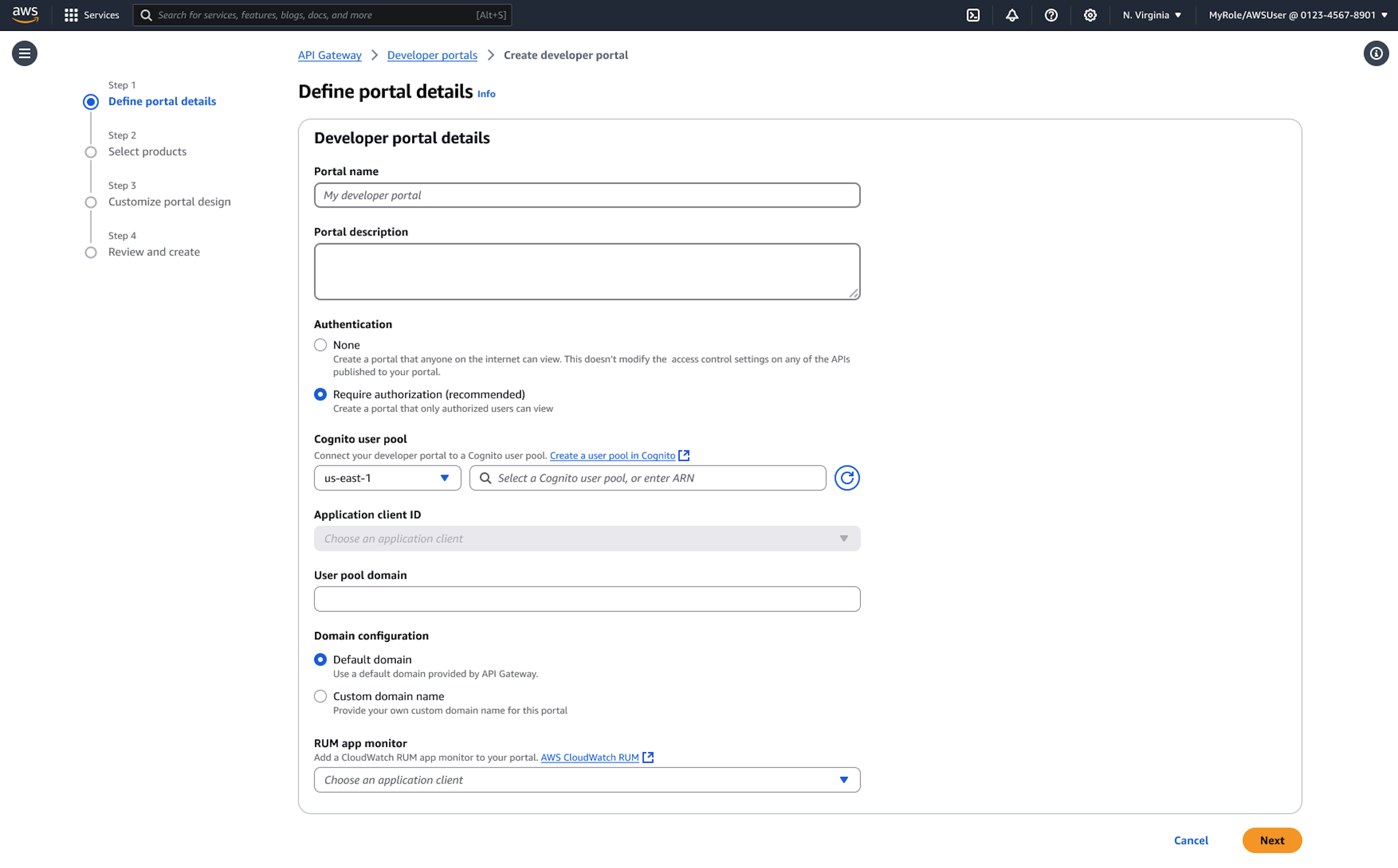 - Configure access control by selecting authentication requirements. For internal portals, you might require Amazon Cognito authentication, while public portals can allow anonymous access to documentation.