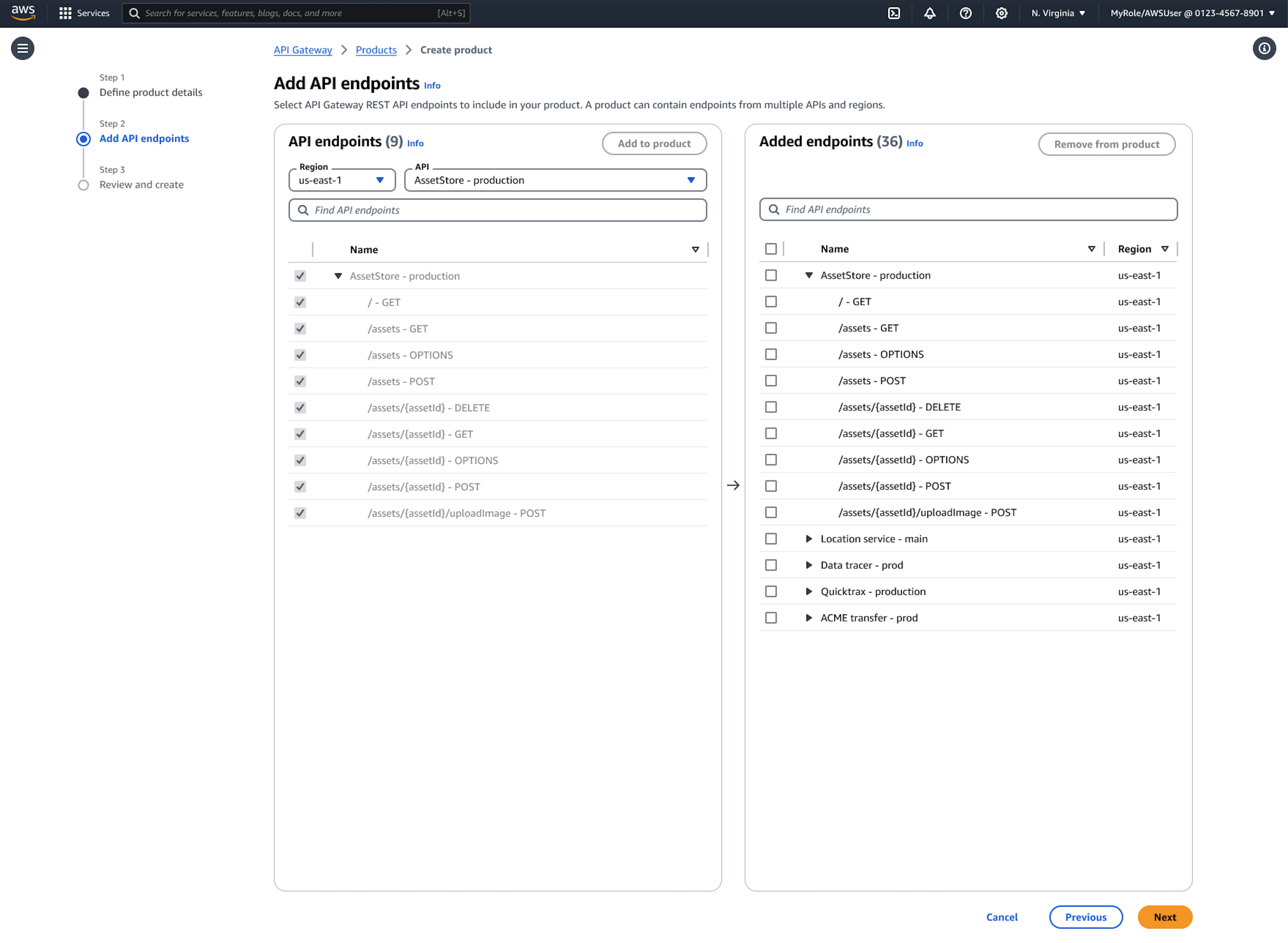 - Next, select the endpoints you want to include in this portal product. You can choose entire API stages or specific resources and methods, and even rename endpoints with user-friendly names for better discoverability.