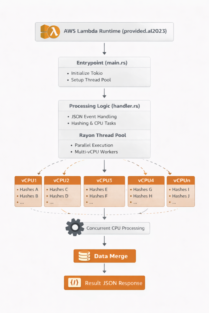 Architecture Diagram: Lambda receives request, initializes Rayon thread pool based on WORKER_COUNT environment variable, processes bcrypt hashes in parallel across multiple vCPUs, and returns results.