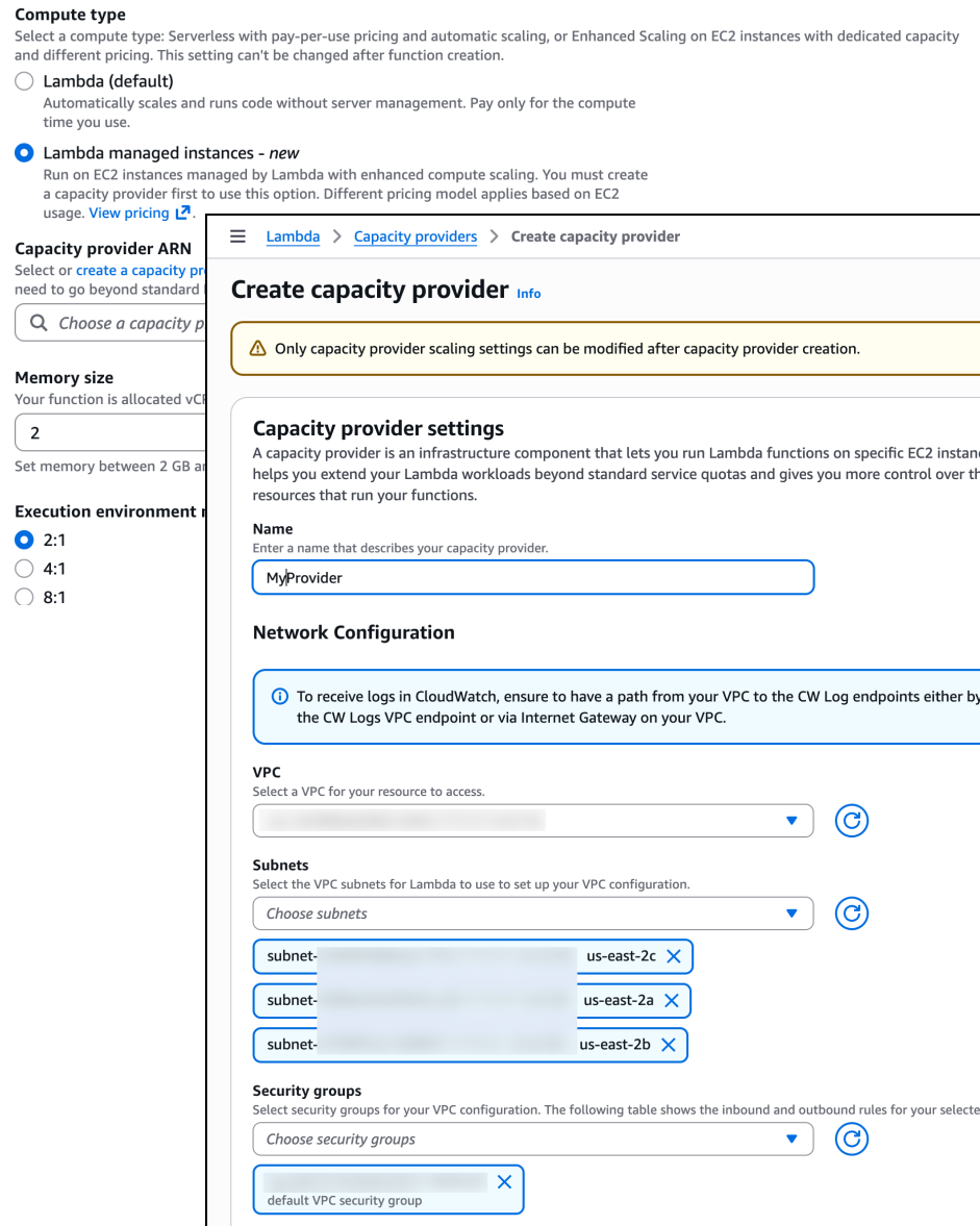 Your functions run on dedicated EC2 capacity from your account, in your own Amazon Virtual Private Cloud (Amazon VPC). AWS still manages the operational overhead, including OS patching, load balancing, and auto-scaling. This gives you access to specialized hardware options while maintaining the serverless operational model. You can further improve costs by using EC2 pricing models, including Compute Savings Plans and Reserved Instances for Lambda workloads. Each instance can handle multiple concurrent requests, making this particularly valuable for high-volume, steady-state workloads where predictable pricing and specific hardware requirements matter.