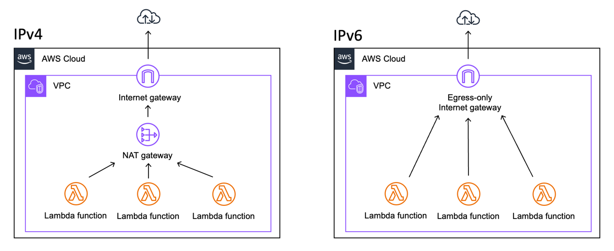 Lambda internet connectivity through a NAT Gateway (IPv4) and Lambda internet connectivity through an egress-only internet gateway (IPv6).