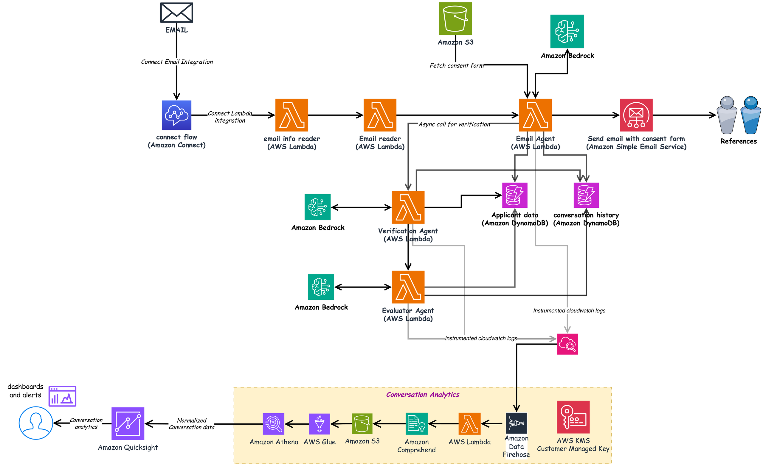 The email processing workflow automatically handles inbound communications through Amazon S3 integration, processing messages with Lambda functions and Bedrock AI capabilities. This enables seamless omnichannel experiences where customers can interact via voice or text while maintaining conversation context