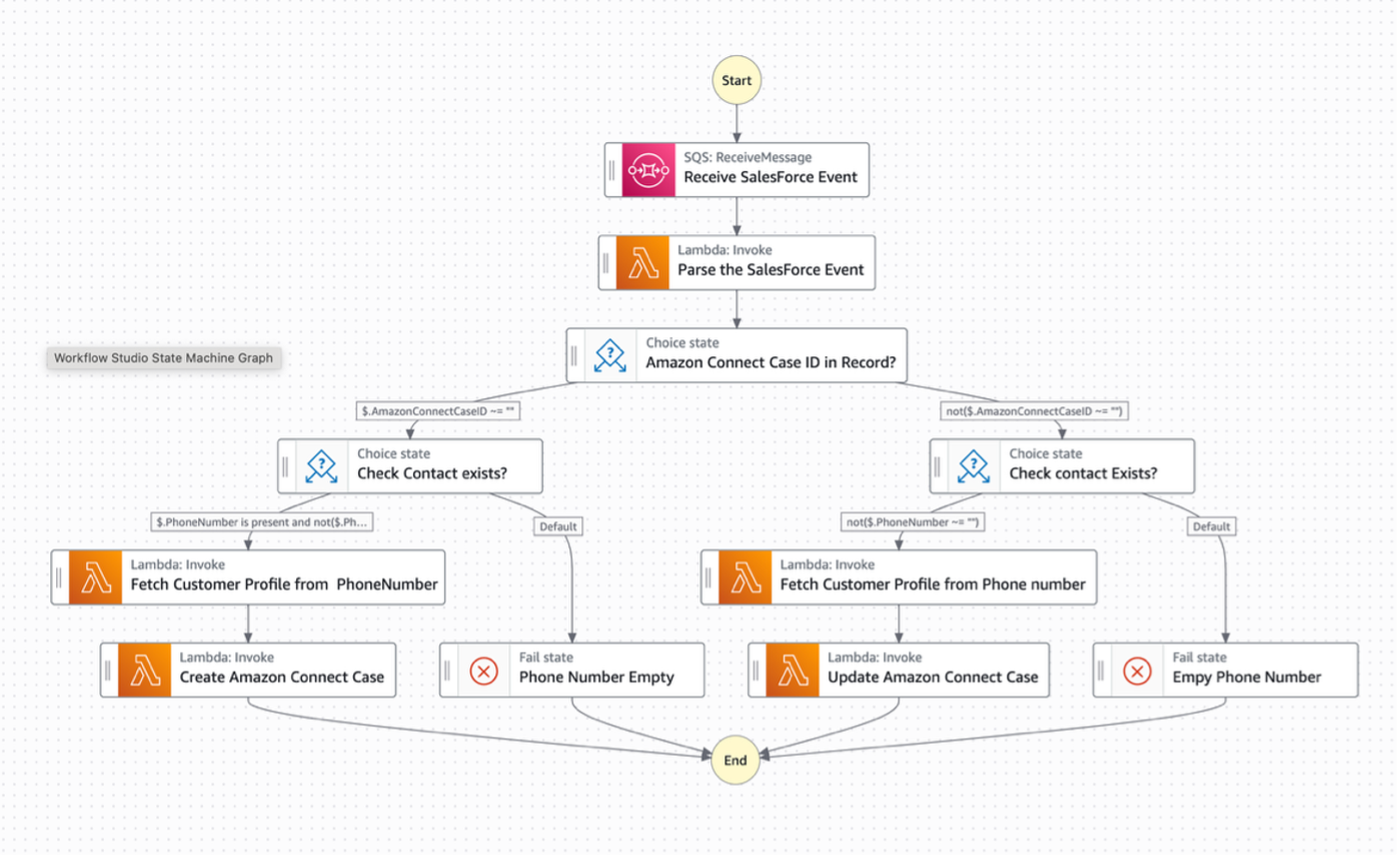 The following image depicts an AWS Step Functions workflow that synchronizes Salesforce cases to Amazon Connect by validating data and creating or updating cases based on Case ID presence.