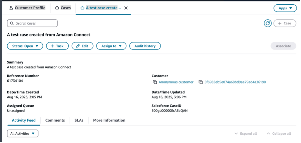 When a case is created in Amazon Connect Agent Workspace, a corresponding case is created in Salesforce. Their details are synced. This process also works for a case created in Salesforce.