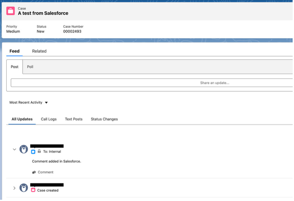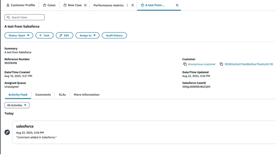 Adding a comment to a case in Salesforce automatically adds the comment in the corresponding case in Amazon Connect and vice versa.