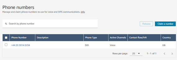 c. Select the desired phone number for testing. If you do not have a phone number available, proceed to via the Claim a number button.