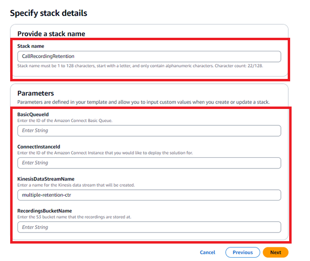 You will be greeted by a form from the CloudFormation service. Provide the Stack name with a descriptive name. These parameters align the template to your specific Amazon Connect instance and recordings bucket.