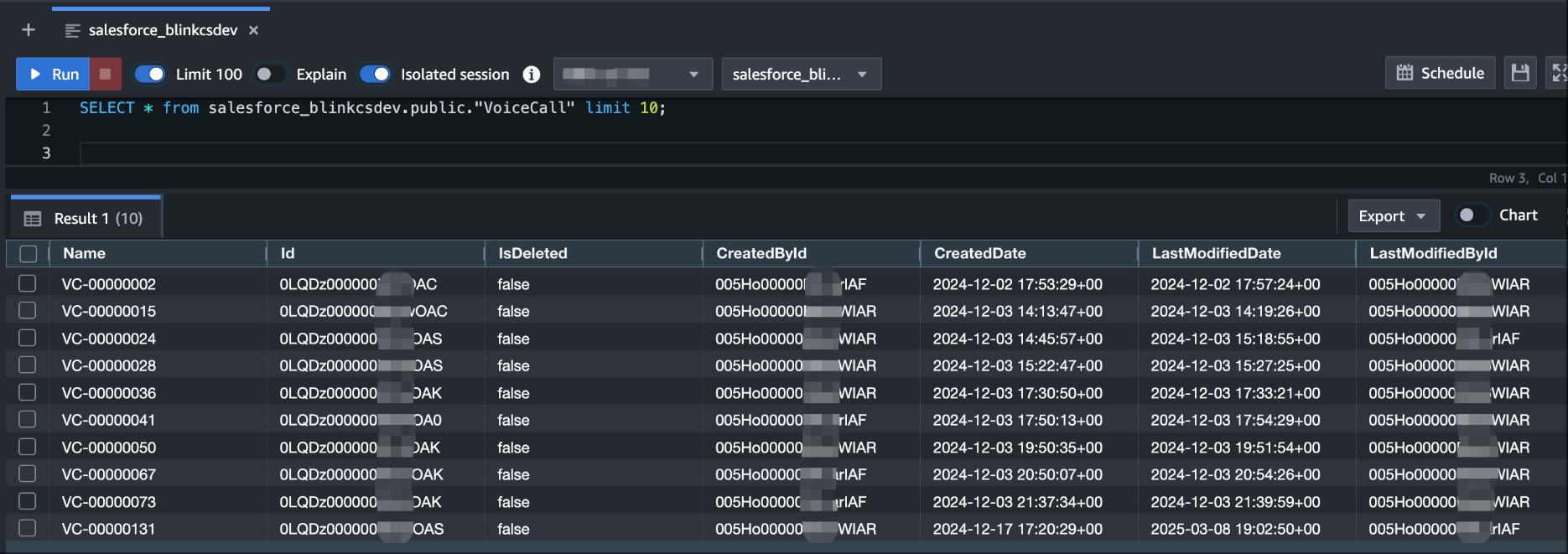 Figure 11: Amazon Redshift Query Editor V2 showing successful data replication from Salesforce VoiceCall object, demonstrating end-to-end integration validation.
