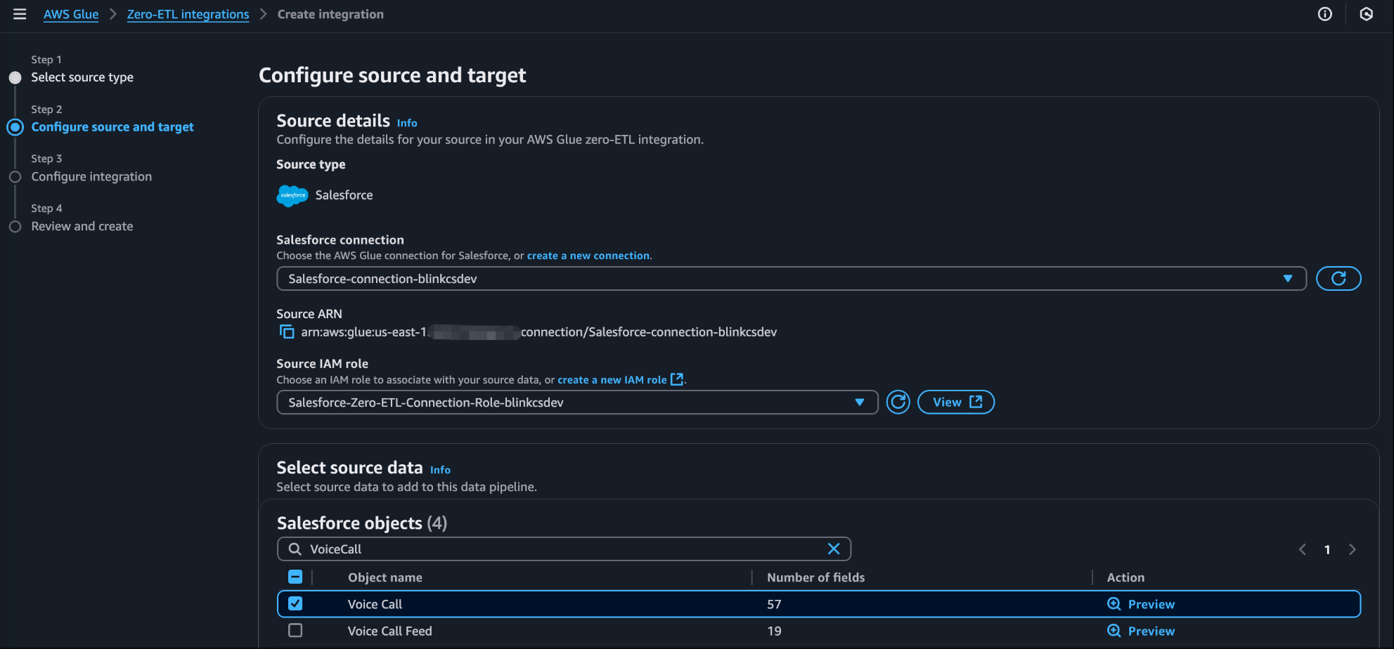 Figure 5: AWS Glue Zero ETL source configuration showing selection of Salesforce objects for replication to Amazon Redshift