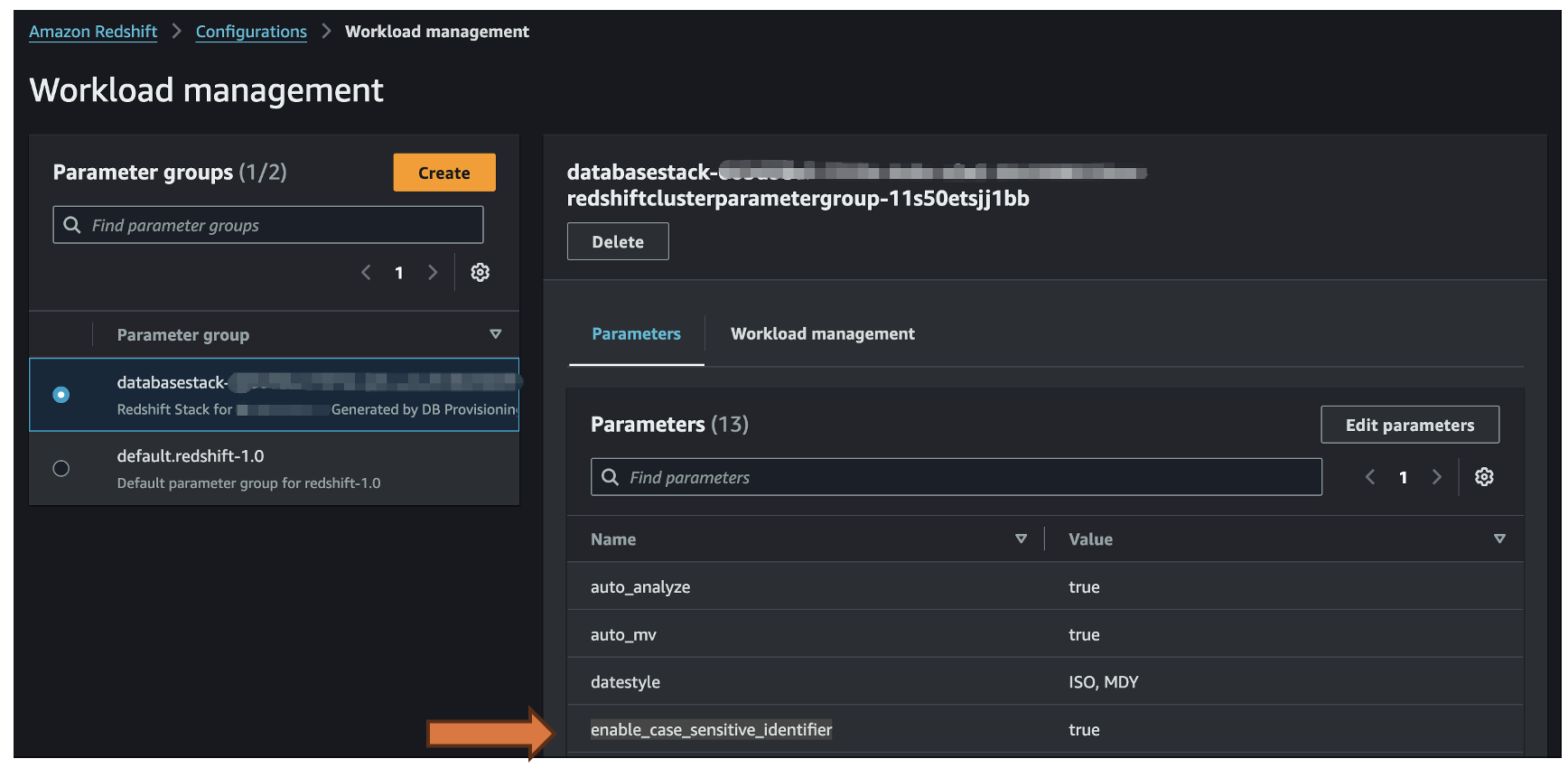 Figure 6: Amazon Redshift cluster parameter group configuration showing required case-sensitive identifier setting for proper Salesforce data mapping