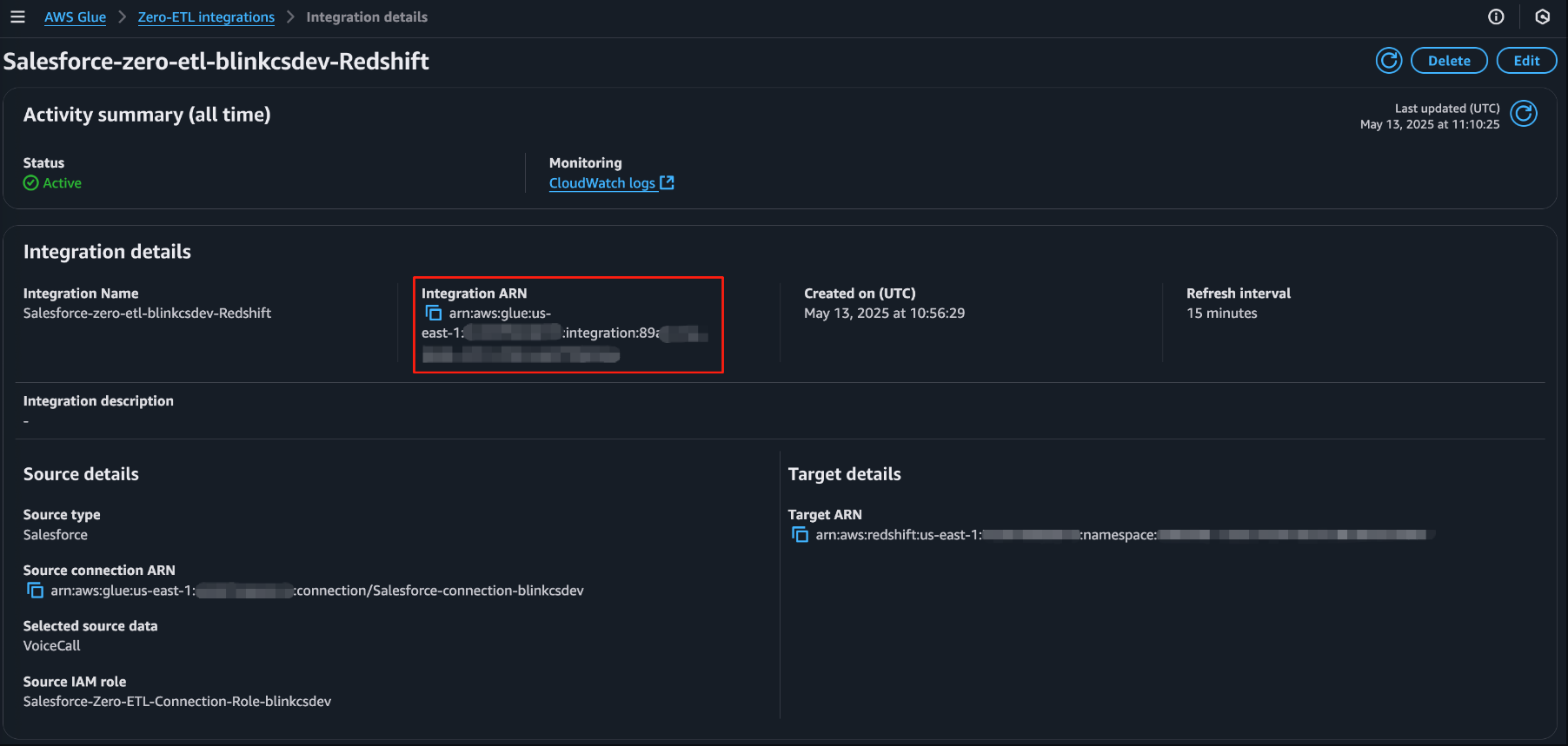 Figure 8: AWS Glue Zero ETL integration status showing successful activation of the Salesforce to Amazon Redshift data pipeline.