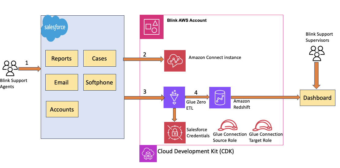 In this post, we’ll explore how Blink by Amazon streamlined their contact center operations by implementing AWS Glue Zero ETL to seamlessly integrate Salesforce CRM data with Amazon Connect. You’ll learn how this solution automates data consolidation, eliminates manual extraction processes, and provides near real-time agent performance reporting – all while maintaining data consistency as your Salesforce environment grows. Whether you’re managing a large contact center or looking to optimize your existing Salesforce and Amazon Connect integration, this solution offers a scalable approach to contact center analytics.