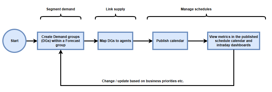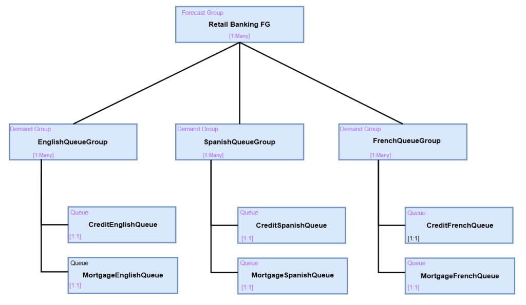- Demand groups (DG): Distinct subsets of work within forecast groups that represent specific workloads requiring specialized agent skills. Each demand group is independently forecasted and mapped to specific queues.