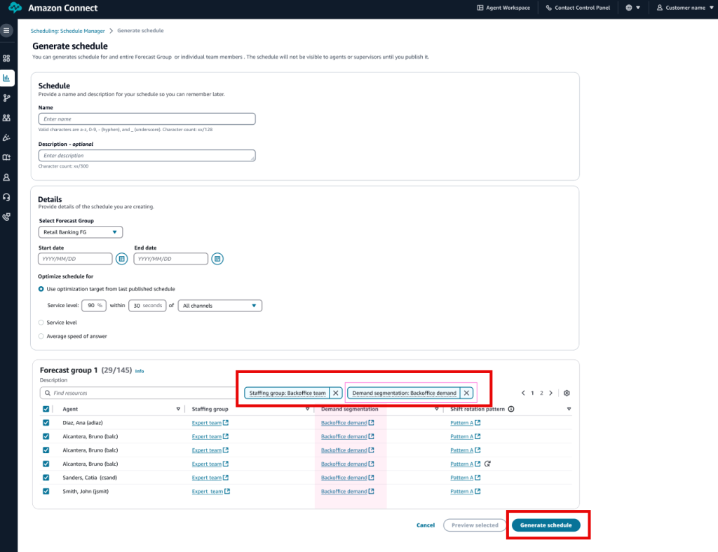 Amazon Connect FCS generates a draft schedule that is hidden from agents until it is published. Schedulers can address warnings or failures and regenerate the draft schedule iteratively, before publishing the final version (see details here). The schedule comprises multiple agent shifts, which include designated work periods and breaks. Amazon Connect independently calculates the required agent headcount for each demand group using forecasted contact volumes, then creates agent shifts according to demand group assignments.