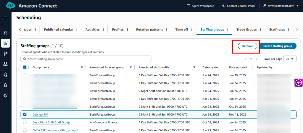 - Staffing groups: Amazon Connect UI allows deleting staffing groups by clicking the ‘Remove’ button as shown in FIG 16 below.